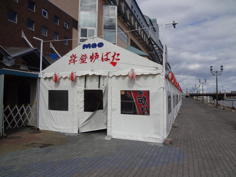 すでに岸壁炉ばたのテントも建ち、テント内の設備や装飾も整えて、お客様をお迎えする