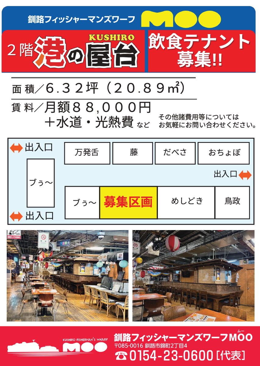 詳細は釧路フィッシャーマンズワーフMOO☎0154-23-0600までお気軽にお問い合わせください。