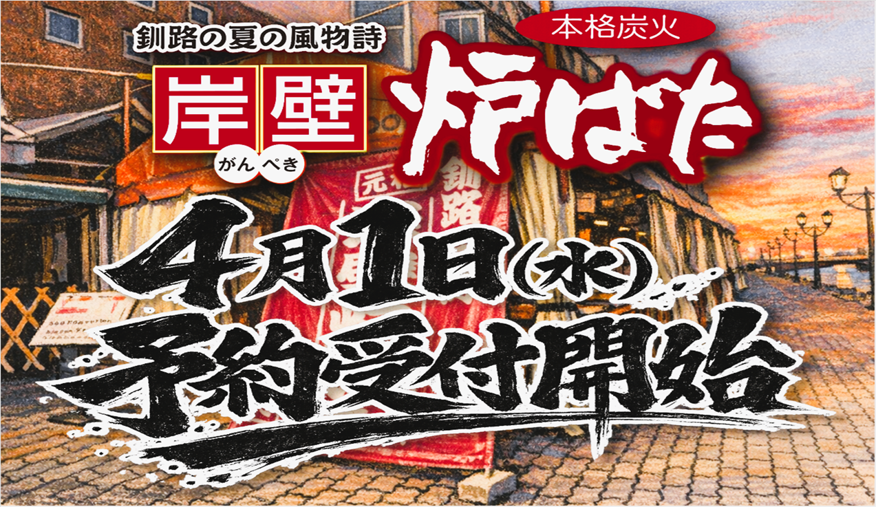 4月1日(水)午前10時より「岸壁炉ばた」の予約受付を開始いたします。営業期間 5月15日(金)~10月31日(土)ご予約は、18時までにご来店可能なお客様のみ承っております。※予約が出来ない日お盆期間 8月13日(木)~8月16日(日)どんぱく 開催日未定皆様のご予約を心よりお待ちしております。電話番号 0154-23-0600 株式会社 釧路河畔開発公社(釧路フィッシャーマンズワーフMOO)