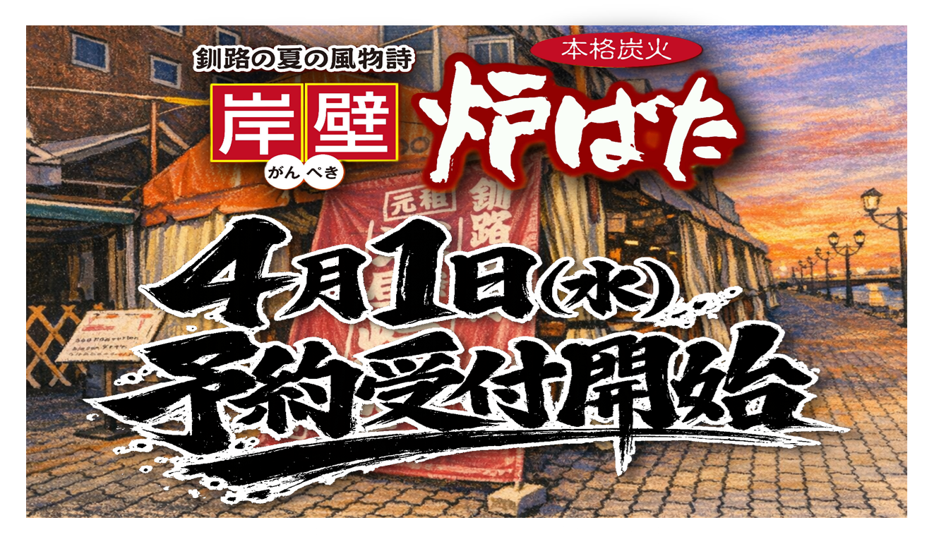 4月1日(水)午前10時より「岸壁炉ばた」の予約受付を開始いたします。営業期間 5月15日(金)~10月31日(土)ご予約は、18時までにご来店可能なお客様のみ承っております。※予約が出来ない日お盆期間 8月13日(木)~8月16日(日)どんぱく 開催日未定皆様のご予約を心よりお待ちしております。電話番号 0154-23-0600 株式会社 釧路河畔開発公社(釧路フィッシャーマンズワーフMOO)