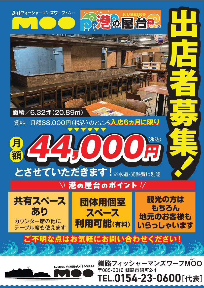 2階「港の屋台」では、現在出店者を募集しております。通常賃料、月額 88,000円(税込) のところ、入店後6か月間に限り月額 44,000円(税込) にてご利用いただけます。 ※水道・光熱費等は別途新規出店をご検討の方は、ぜひこの機会にご相談ください。お問い合わせは、釧路フィッシャーマンズワーフMOO ☎0154-23-0600まで