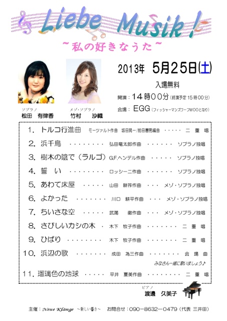 5月25日(土)午後2時より、EGG特設会場におきまして、ノイエ・クレンゲ コンサート「Liebe Musik!~私の好きなうた~」を開催いたします。釧路市を中心に活動を行っている声楽グループ“ノイエ・クレンゲ”のメンバーである、松田有律香さんと竹村沙織さんのお二人が、クラシックや童謡・唱歌など、優雅で美しく、心地よい声楽の響きをご披露いたします。観覧は無料でございますので、どうぞ皆様、お誘い合わせのうえお越しくださいませ。