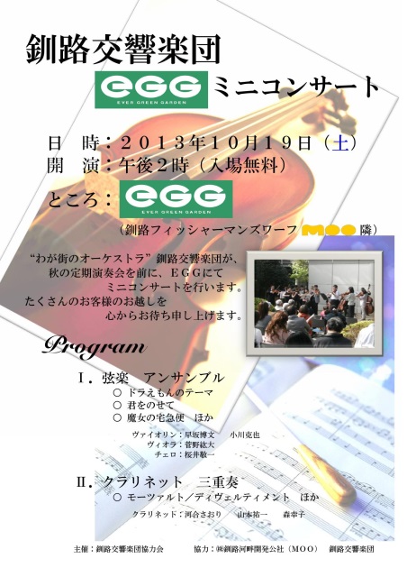 【イベントのご案内】10月19日(土)14:00~ EGG特設ステージ 「釧路交響楽団 EGGミニコンサート」