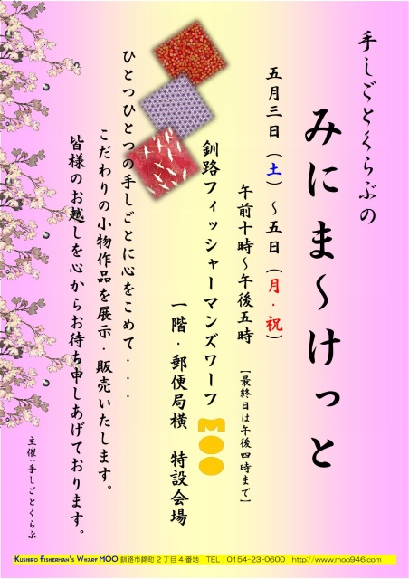 5月3日(土)から5日(月)までの3日間、MOO1階・郵便局横の特設会場におきまして、「手しごとくらぶの『みに・ま~けっと』」を開催いたします。会場では、釧路市内で活動する「手しごとくらぶ」において、ひとつひとつに心を込めて、手間をかけて製作した、こだわりの手しごと作品をはじめとした、和の小物作品などを展示・販売いたします。皆様のお越しを心からお待ち申し上げております。