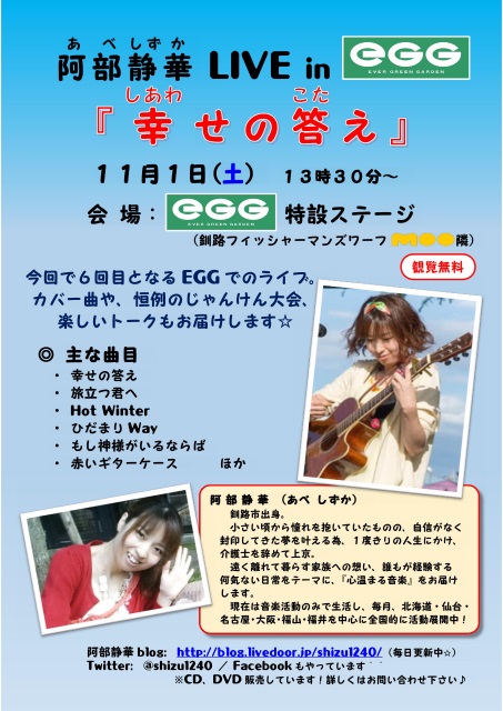 11月1日(土)午後1時30分からEGG特設ステージにおきまして「阿部静華LIVE in