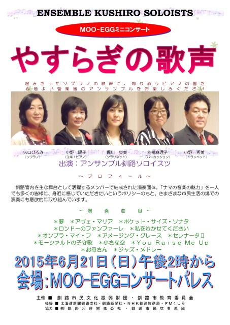 6月21日(日)午後2時から、EGG特設会場におきまして「EGGミニコンサート『やすらぎの歌声』」を