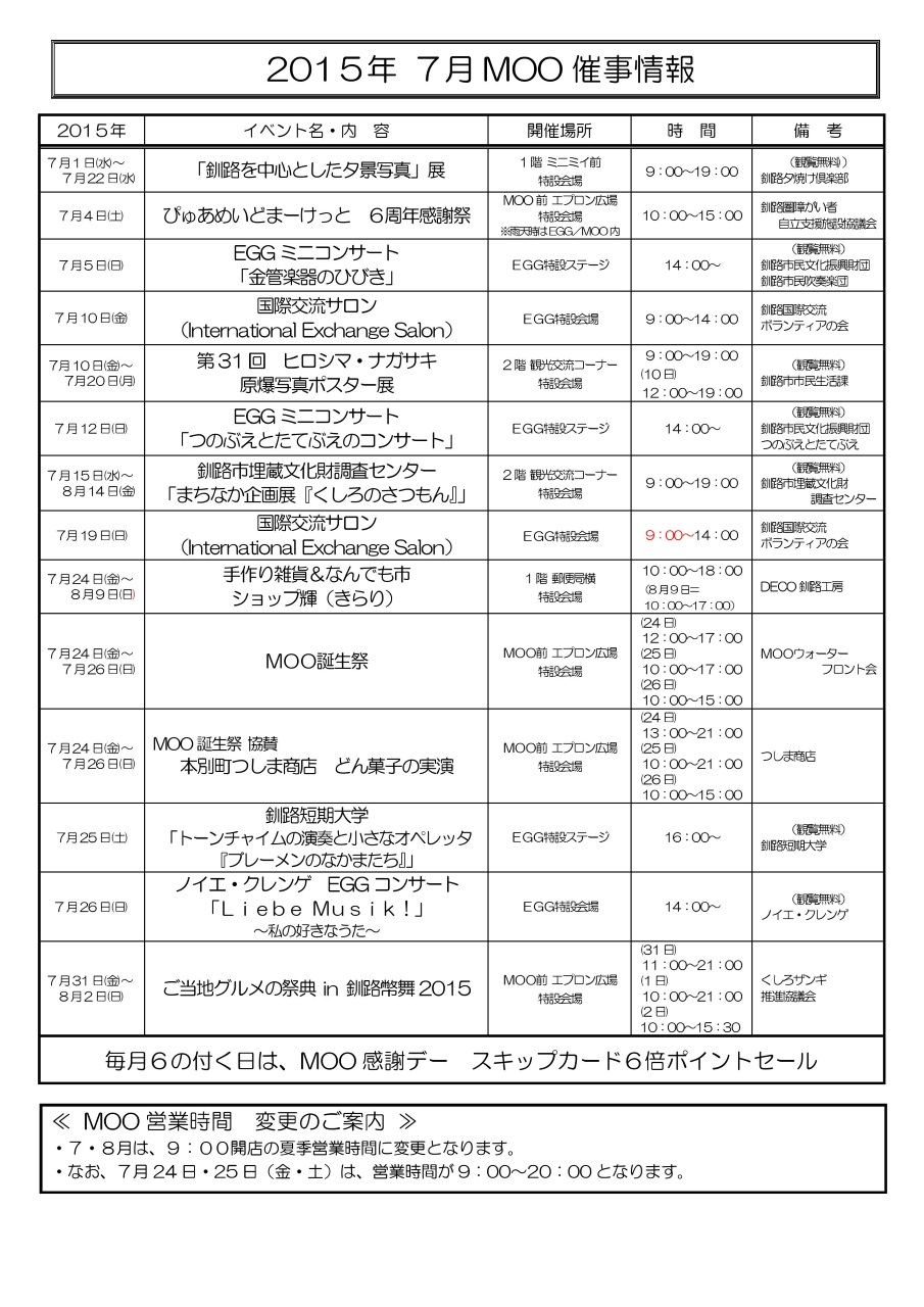 先日掲載いたしました「2015年7月 MOO催事情報」に誤りがございましたので、