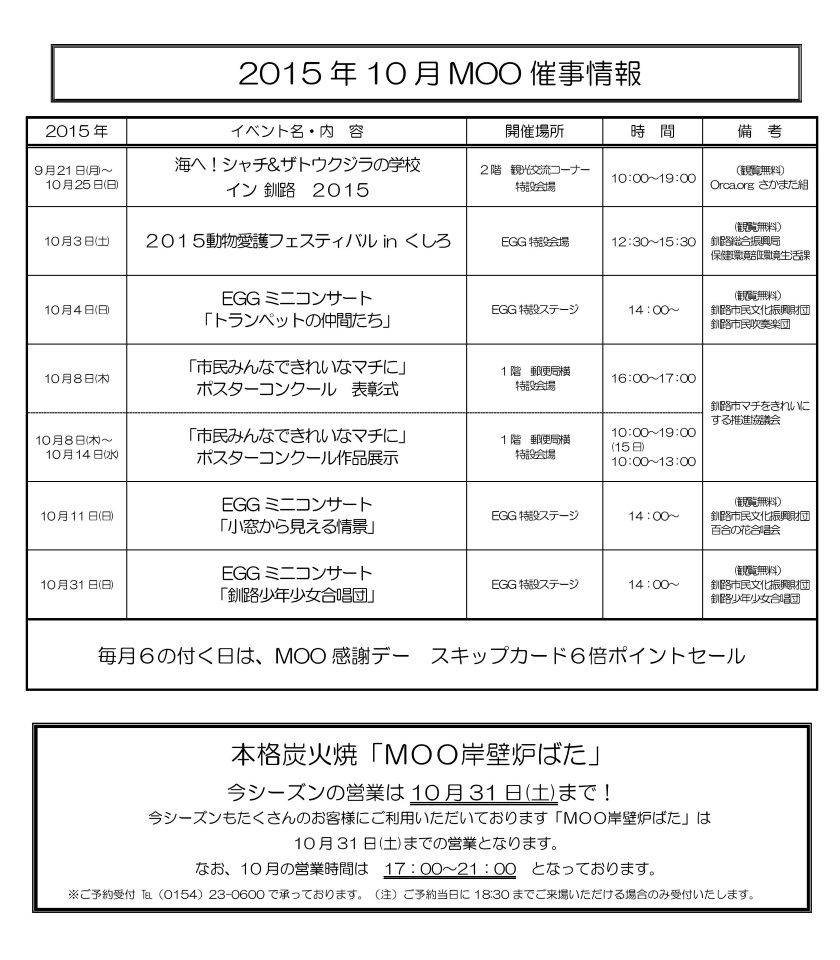 Home > インフォメーション > 10月のMOO/EGGのイベント情報のご案内