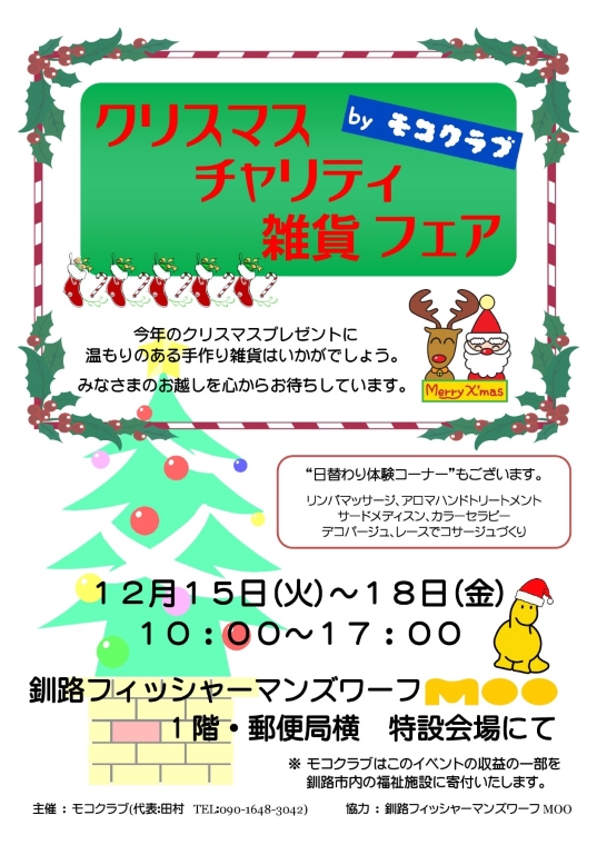【イベントのご案内】12月15日(日)~18日(金)10:00~17:00 MOO1階・郵便局横特設会場「クリスマスチャリティ雑貨フェア by モコクラブ』