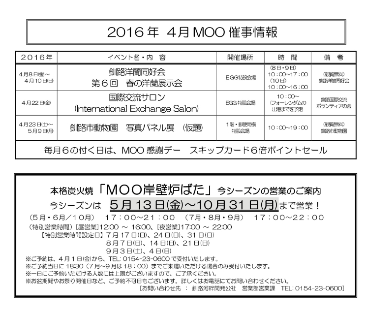 Home > インフォメーション > 4月のMOO/EGGのイベント情報のご案内