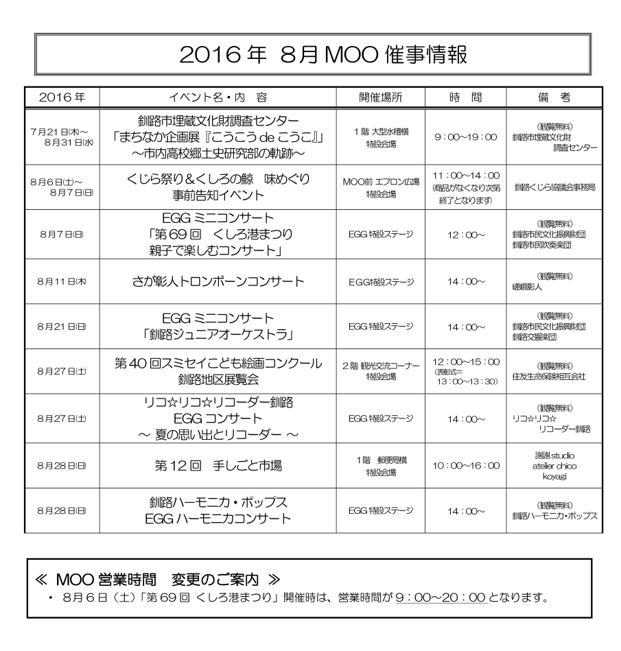 Home > インフォメーション > 8月のMOO/EGGのイベント情報のご案内