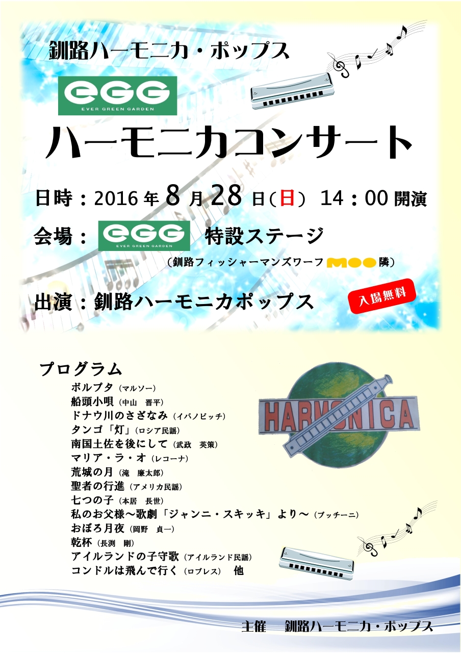 「釧路ハーモニカ・ポップス EGGハーモニカコンサート」を開催いたします。