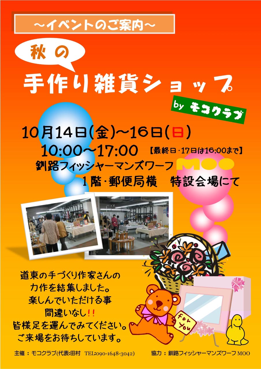 おきまして「秋の手作り雑貨ショップbyモコクラブ」を開催いたします。