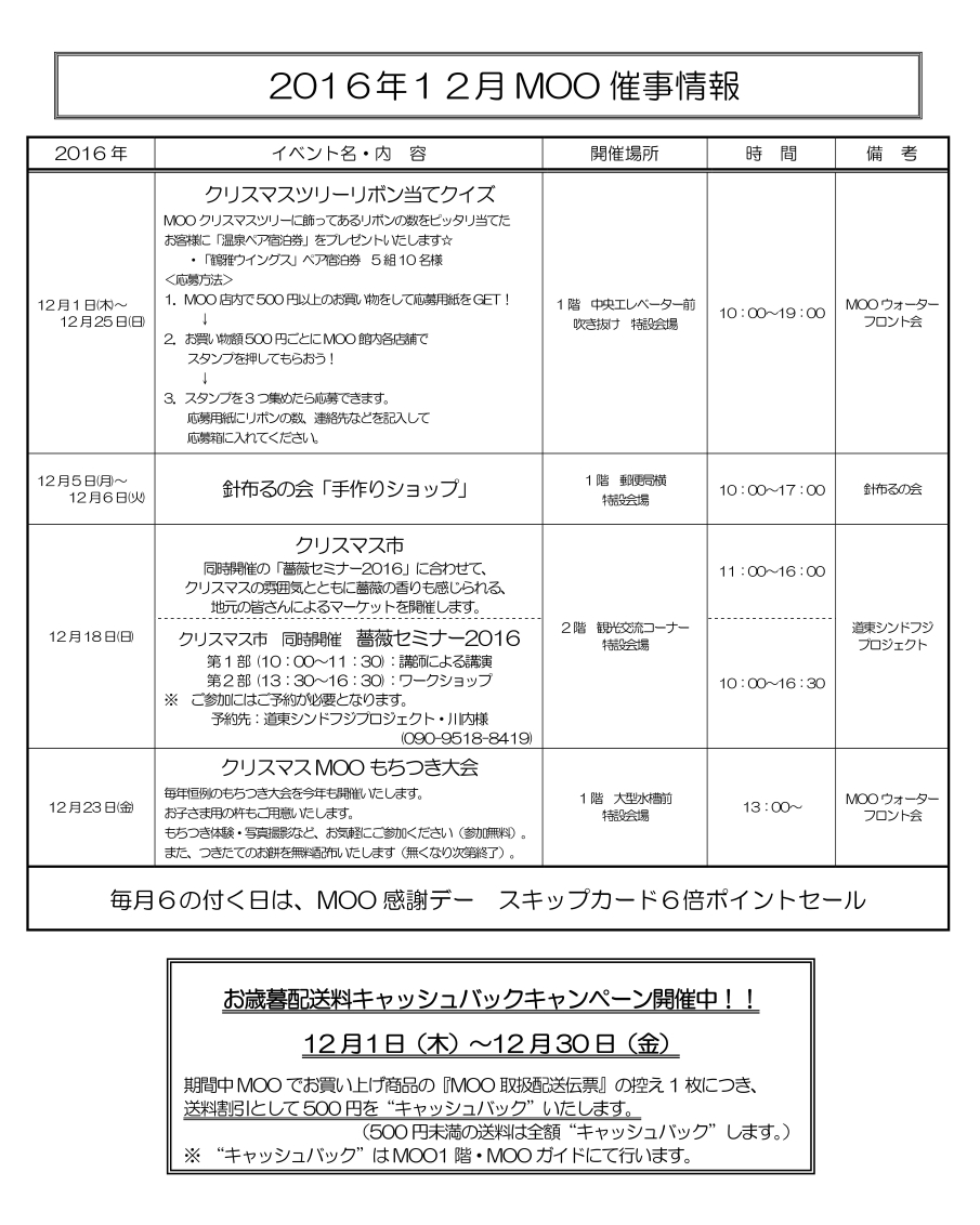 ※ “キャッシュバック”はMOO1階・MOOガイドにて行います。