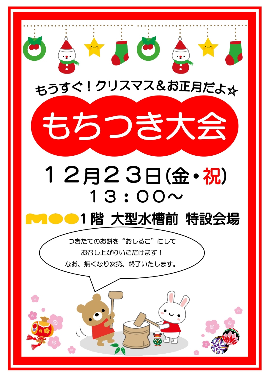 12月23日(金・祝)午後1時から、1階・大型水槽前の特設会場におきまして、「MOOもちつき大会」を開催いたします。年末恒例となっているMOOのもちつき大会。今年もこの1年のご愛顧に感謝の気持ちを込めて、つきたてのお餅を「おしるこ」にして無料配布いたします。どうぞ皆様お誘いあわせのうえ、ご来場くださいませ。※ もちつきは係の者が行います。 お客様はもちつきを体験いただけませんので、ご了承くださいませ。