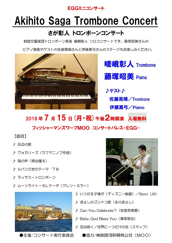 7月15日(月祝)午後2時より、EGG特設ステージにおきまして「さが彰人トロンボーンコンサート」を開催いたします。