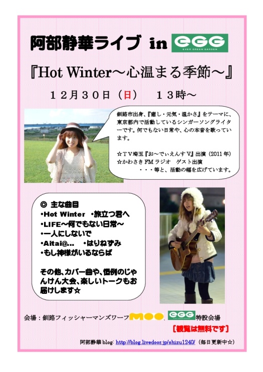 【イベント開催のご案内】12月30日(日)午後1時~ 「阿部静華ライブ in EGG 『Hot Winter~心温まる季節~』」