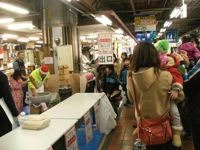 年末恒例の「クリスマスMOOもちつき大会」を、1階・大型水槽前の特設会場