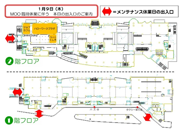 1月9日(木) MOOメンテナンス休業に伴いまして、当日は館内の出入口を4か所に限らせていただきます。当日、各公共施設をご利用の際には改めてご確認いただければ幸いです。1月10日(金)以降は、釧路フィッシャーマンズワーフMOOは休まず営業いたします。今後とも釧路フィッシャーマンズワーフMOOをご愛顧くださいますよう、なにとぞよろしくお願い申し上げます。