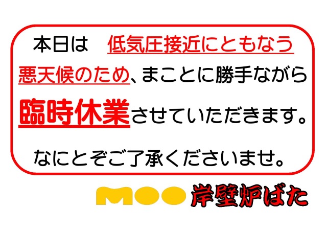 本日(10月14日・火)、「岸壁炉ばた」は台風19号から変わった温帯低気圧による悪天候のため、まことに勝手ながら臨時休業させていただきます。なにとぞご了承くださいませ。なお、明日以降は平常通りの営業を予定いたしております。今シーズンの「岸壁炉ばた」は10月31日(金)まで営業いたします。明日以降もぜひご利用くださいますよう、心からお願い申し上げます。