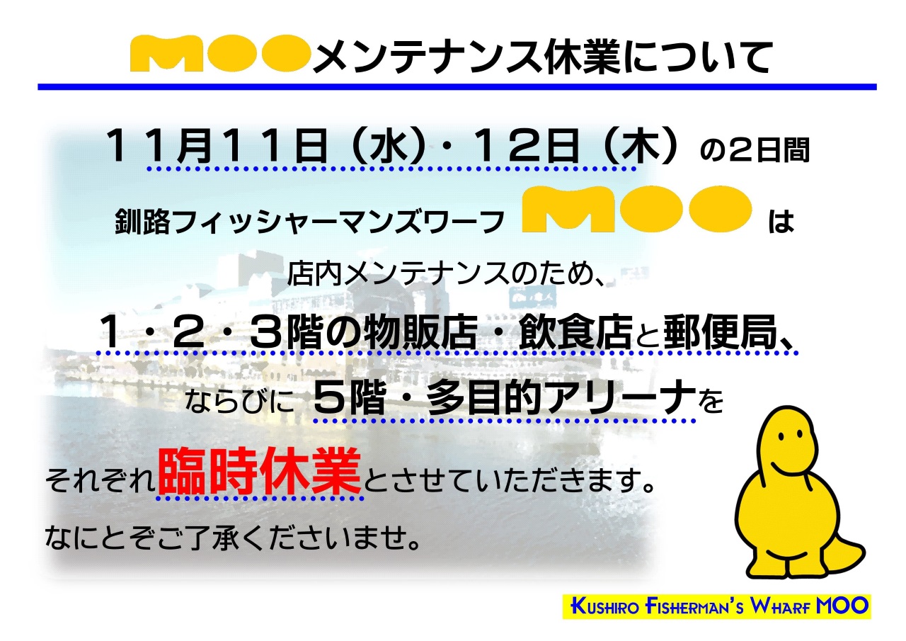 11月11日(水)、12日(木)の2日間は、MOO館内、設備メンテナンスの為、1階・2階・3階の飲食店・物販店と郵便局、ならびに5階・多目的アリーナをそれぞれ休業とさせていただきます。皆様にはたいへんご迷惑をおかけいたしますが、なにとぞご了承くださいませ。※ 飲食・物販店舗以外の公共施設は平常通りの業務を行います。※ 13日以降は平常通りの営業となります。