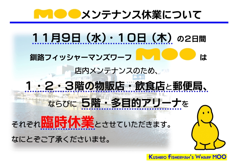 11月9日(水)、10日(木)の2日間は、MOO館内、設備メンテナンスの為、1階・2階・3階の飲食店・物販店と郵便局、ならびに5階・多目的アリーナをそれぞれ休業とさせていただきます。皆様にはたいへんご迷惑をおかけいたしますが、なにとぞご了承くださいませ。※ 飲食・物販店舗以外の公共施設は平常通りの業務を行います。※ 11日以降は平常通りの営業となります。