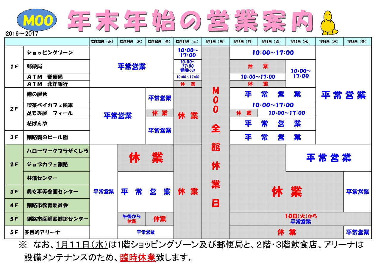 Home > インフォメーション > 釧路フィッシャーマンズワーフMOOの年末年始の営業についてご案内いたします。