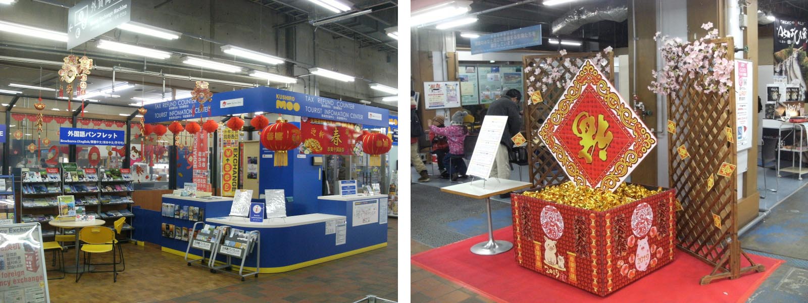 同じく1階・釧路市場の大型水槽前にそれぞれ春節飾りを設置いたしました。