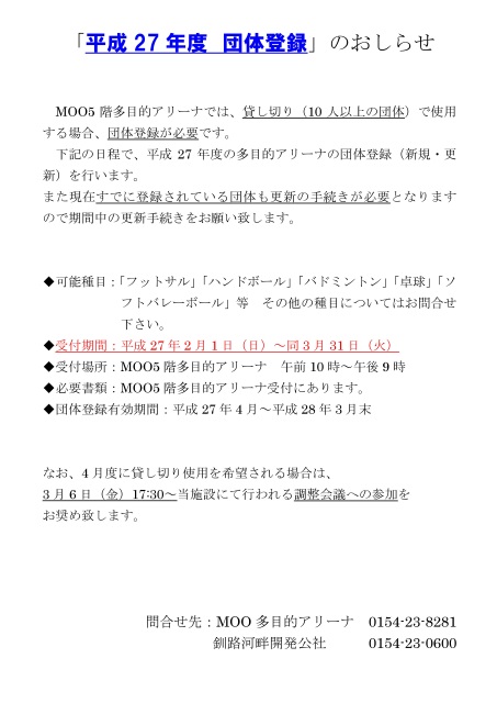 【5階・多目的アリーナ】平成27年度団体登録のお知らせ