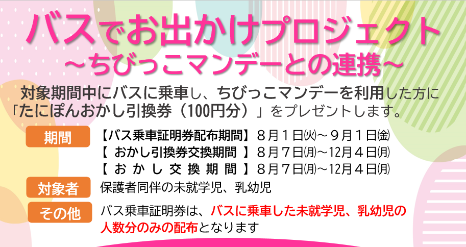 対象期間(8月1日~9月1日)にバスに乗車し、ちびっこマンデーを利用された方に「たにぽんおかし引換券(100円分)」をプレゼント!問い合わせ先 釧路市地域公共交通活性化協議会 0154-31ー4502