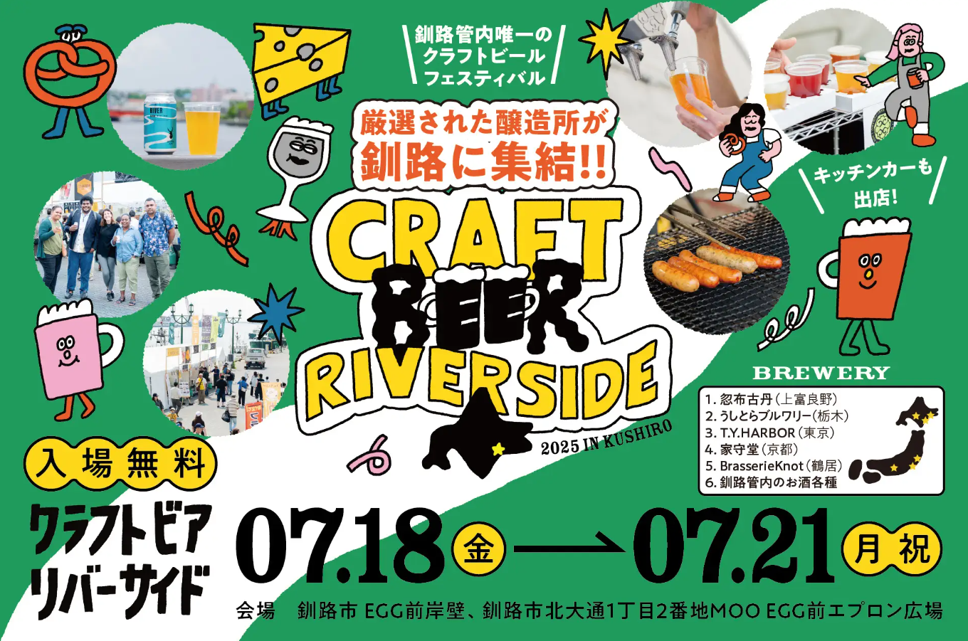 開催期間 : 2025年7月18日(金)~2025年7月21日(祝) 営業時間:11-21時(7月18日(金)のみ16-21時)会場:釧路市EGG前岸壁、釧路市北大通1丁目2番地MOO EGG前エプロン広場(釧路フィッシャーマンズワーフMOO隣)クラフトビールセミナー: 2025年7月18日(金)~2025年7月20日(日) 11時より30分間主催:クラフトビアリバーサイド実行委員会入場料:無料(前売り券の販売はございません)