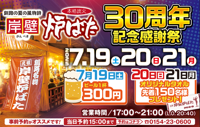 MOO岸壁炉ばたは今年で30周年を迎えます!30周年を記念して、特別イベントを下記日程にて開催いたします!岸壁炉ばた30周年記念感謝祭開催日時7月19日(土)~21日(月祝)19日(土)生ビール 通常価格650円のところ、300円でご提供20日(日)・21日(月祝)先着300名のお客様に、岸壁炉ばた30周年オリジナルタオルをプレゼント(各日150枚)営業時間17時~21時まで(ラストオーダー 20時40分)皆様のご来店、心よりお待ち申し上げております。