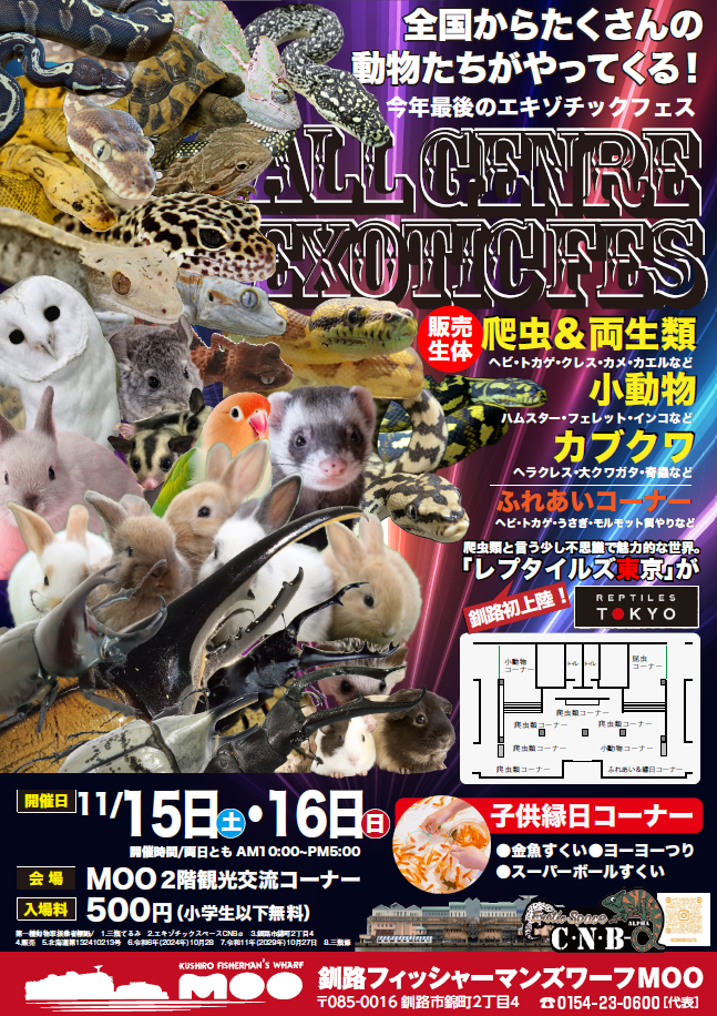 さまざまな爬虫類、昆虫を展示販売いたします。こども縁日も予定しております。日時 11月15日(土)16(日)10時~17時場所 観光交流コーナー入場料 500円(小学生以下無料)皆様のご来館心よりお待ちしております。