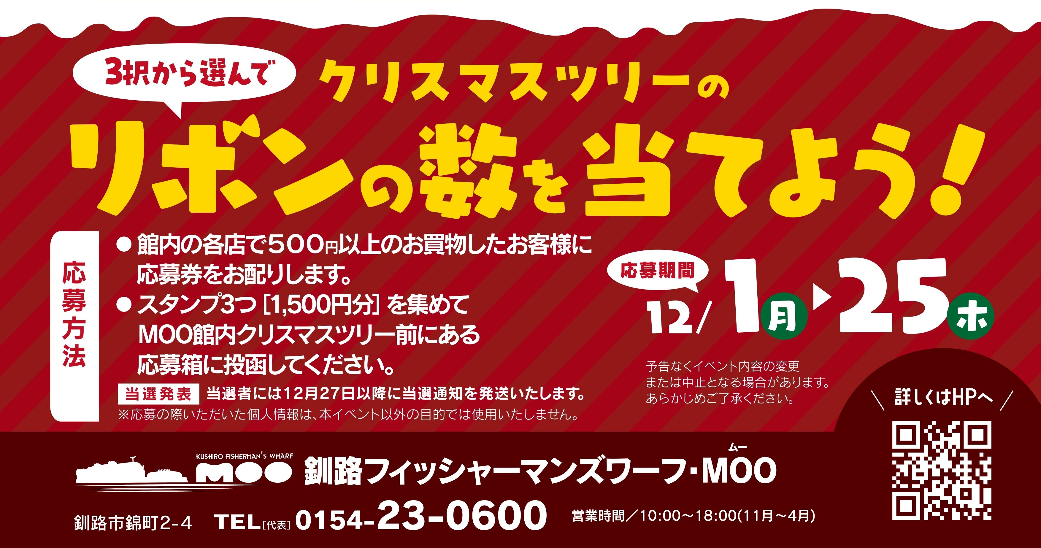 クリスマスツリーのリボンの数あてクイズに応募して1万円分のMOO商品券を当てよう! ①500円以上お買上げのお客様に応募券をお配りします。 ②MOO館内のお買物、お食事500円毎に1スタンプ押します。 ③スタンプを3つ(1,500円分)集めてMOO館内にあるクリスマスツリー前の応募箱に応募用紙を投函してください。応募期間 12月1日(月)~12月25日(木)当選発表 12月27日以降、当選者に当選通知を発送いたします。たくさんのご応募お待ちしております。
