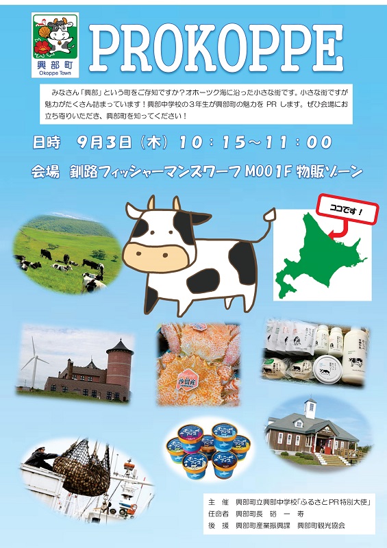 9月3日(木)の10時15分~11時 1階物販ゾーンにおきまして修学旅行で訪れる興部中学校3年生の生徒様による「興部町の魅力PRキャンペーン」を実施いたします。どうぞ皆さま、是非会場へお立ち寄りください!