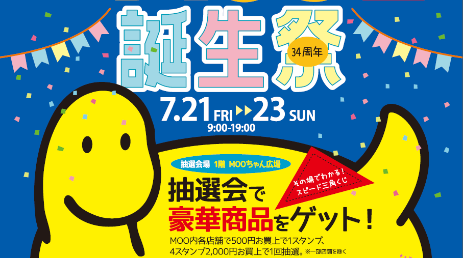 日時 7月21日(金)~23日(日)時間 午前9時~午後7時まで抽選会場 1階 MOOちゃん広場各テナントにて500円お買上で1スタンプ、4スタンプ2,000円分お買上で1回抽選。各テナント賞を多数ご用意!皆様のご来館心よりお待ちしております。