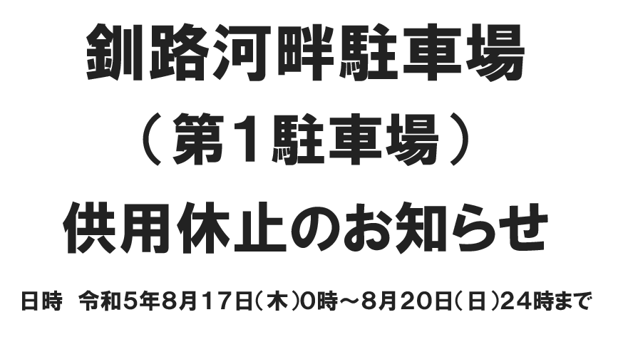 日時 令和5年8月17日(木曜日)0時から8月20日(日曜日)24時までイベント開催(「釧路スタジオ」)のため、釧路河畔駐車場(第1駐車場)の供用を休止します。供用休止期間中は、釧路河畔駐車場(第2駐車場)又は釧路錦町駐車場(釧路市錦町4ー7)をご利用ください。駐車場に関するお問い合わせ 釧路錦町駐車場 0154-22-8735