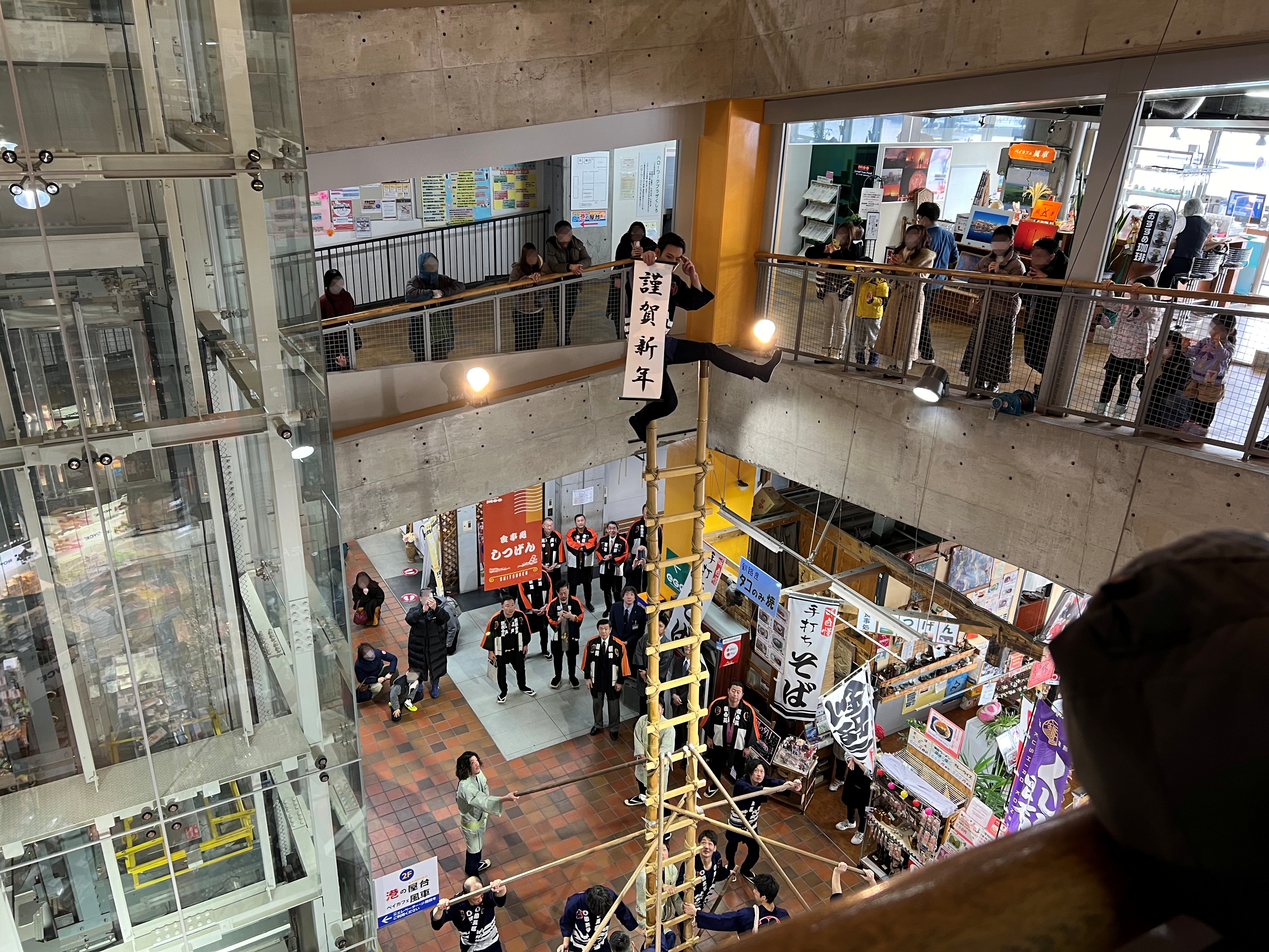 新年、あけましておめでとうございます。本日、釧路フィッシャーマンズワーフMOOでは、正午より、1階の中央エレベーター前特設会場で開催された「釧路若鳶会 新春出初め式」にて、釧路若鳶会の皆さんに勇壮な「木やり歌」、華麗な「はしご乗り」の妙技を披露していただき、新年の門出を祝いました。辰年は飛躍の年です。本年もよろしくお願い申し上げます。
