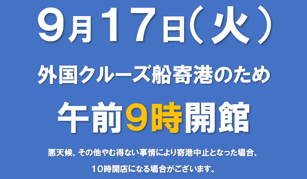 9月17日(火)は外国クルーズ船が西港に寄港するため、午前9時開館となります。